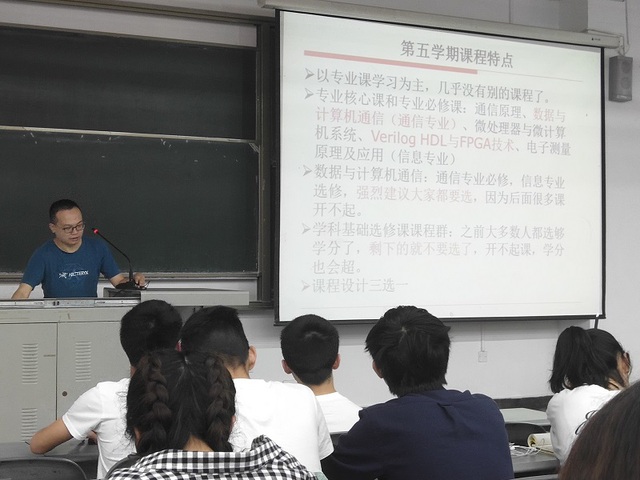 21日中午,信息工程系主任郭奕老师为信息工程、通信工程专业及专升本的同学详细介绍了下学期的课程特点,他建议大家选数据与计算机通信课程,并对学分的控制提出了宝贵建议。