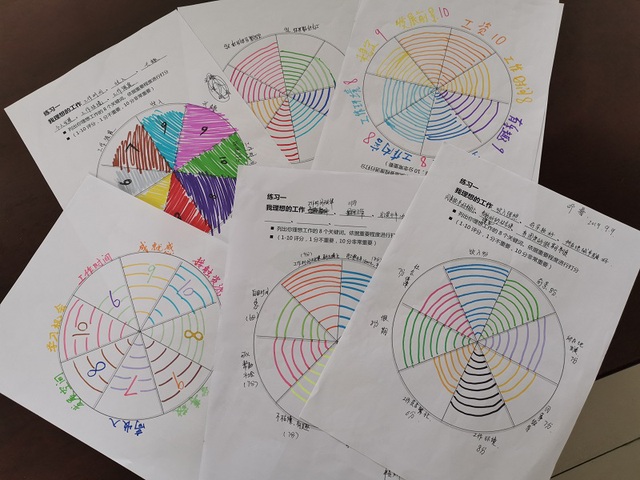 在初步明确自己对未来的期待后,同学们开始利用生涯平衡轮的工具,探索自己希望找到一份什么样的工作,对理想中的工作描述八个关键词,并按重要性进行打分,形成自己的求职目标。