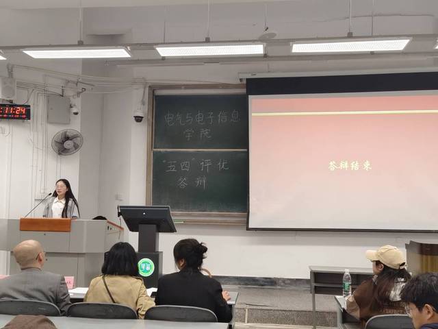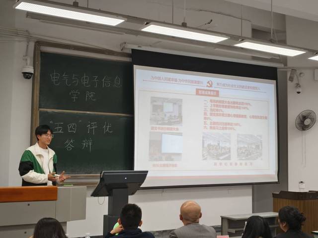 大会在全体奏唱团歌声中开始,主持人对答辩流程及相关规则进行介绍。大会在全体奏唱团歌声中开始,主持人对答辩流程及相关规则进行介绍。各支部答辩人从支部概况、学习情况、支部荣誉等多个方面对本支部目前的建设成果进行展示,同时列举出支部建立以来的青年大学习完成率、四六级通过率、挂科率等各项数据并作为本次评优的参考指标。答辩现场氛围热烈,精彩纷呈,展现出了优良的电气青年形象。他们不但学习成绩优异,还做到了全方面的锻炼自我,有的团员在各个实验室参加国家级和省级比赛摘得荣誉;有的在寒假期间为挂科同学提供学习资料,帮助他们顺利通过补考;有的在志愿服务的道路上一直前行,为社会贡献出青春力量。一个个优秀的青年团员组成了团结奉献优异的优秀团支部。