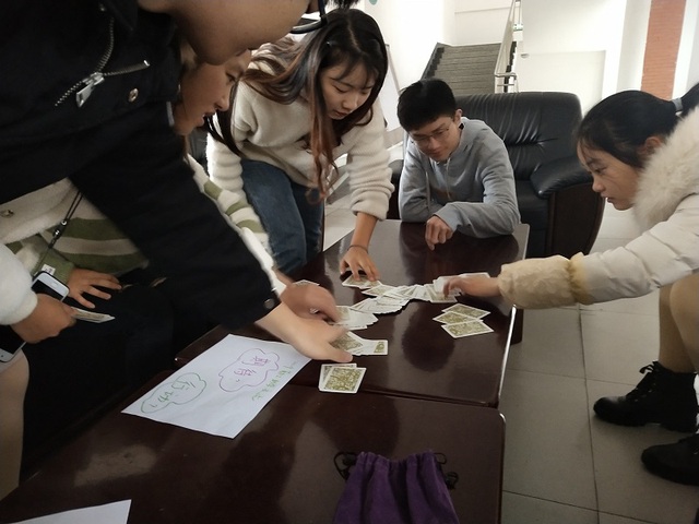 会议伊始,刘秀丽老师以卡牌游戏切入正题,引导勤工助学成员分享自己从事助学工作的点滴感悟。同学们从所有卡片中随机抽取4张并两两分开,结合图片意境,老成员和小组成员分别从收获建议、期待行动方面一一阐述。
