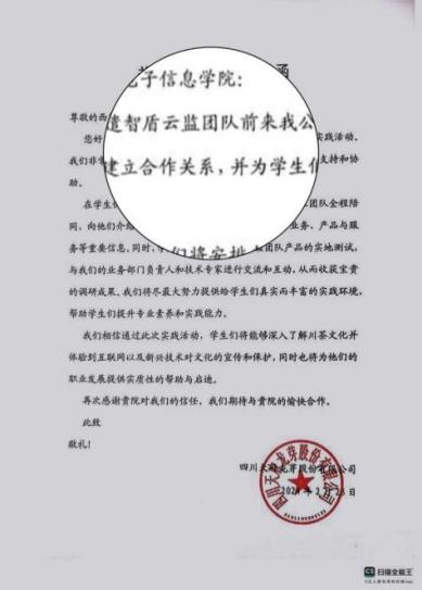 系统研发成功后,“智盾云监”团队于2024年2月23日前往四川中通雅创文化传播有限公司、四川天府龙芽股份有限公司进行系统试点实验。试验分析结果精确度高,得到了试点单位的一致认可,各单位现场与团队签署合作意向书。