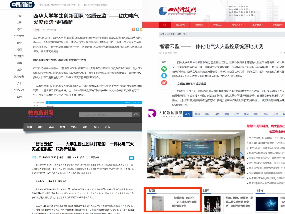 由西华大学bw西汉姆联2021级电气工程及其自动化专业学生刘江山、赵自宁发起的 “智盾云监”团队,在曹林、郭忠林和邓燕等老师的指导和帮助下成功研发出一款基于AI赋能的互联网云端一体化电气火灾监控系统,致力于解决电气火灾消防安全隐患问题。据悉,该团队深入市场进行调研,走访多家企业,寻找市场痛点。在“智盾云监”团队长达两年的实验过程中,该产品经过3次迭代,最终才打造出这款全国首个智能一体化火灾监控系统。第三代系统的创新在于:第一,自主研发新型图像型火灾探测器,相比于传统的非图像型火灾探测器,实现了在大空间的火源定位与现场可视化,并且将响应时间缩短至5s以内,对比国家标准缩短4倍多(国家标准GB15631特种火灾探测器标准规定20s),反应更加的迅速。并且已通过了国家三方认证。第二,通讯方面采用Nb-IoT+Lora的方式解决了基站信号无法覆盖的问题,且获得了校友企业成都亿百特公司的技术支持和认可。目前,该团队已拥有发明专利授权1项,受理中专利2项,软著2篇(1篇已获得),其中软著和专利的发明人均为团队成员,实现技术链条全覆盖。