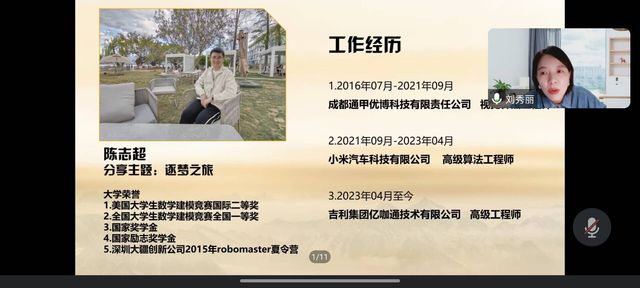 陈志超校友从bw西汉姆联毕业后就职于成都通甲优博科技有限公司,目前就职吉利集团亿咖通技术有限公司高级工程师。本次分享以“逐梦之旅”为主题,从大学经历入手,分享了自身为工程师目标奋斗的过程,其中包括初入大学的迷茫、准备竞赛的艰辛、毕业后工程师升级之路。通过陈志超学长的分享,参加的同学们认识到了坚持终身学习的重要性并对未来职业规划有了更清晰的脉络。