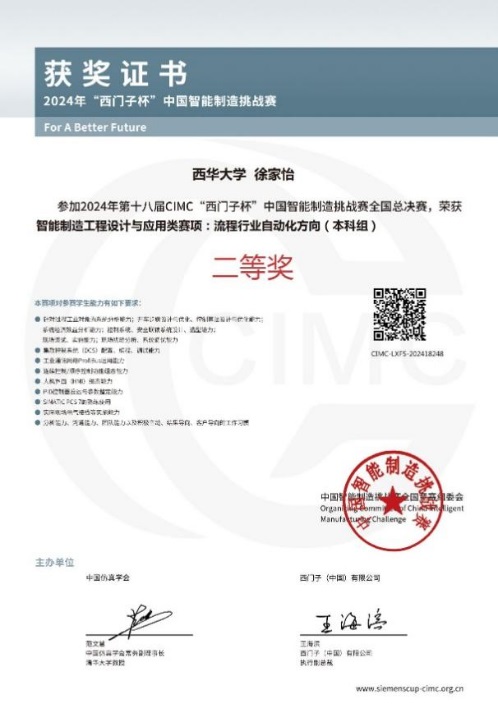 CIMC“西门子杯”中国智能制造挑战赛是中国智能制造领域规模最大、规格最高的一项国家级A类学科竞赛。本届初赛共有来自全国756所高校5800多支队伍近25000余名师生参赛,经过激烈比拼角逐,共有598支队伍脱颖而出晋级全国总决赛。我院共有4支队伍参加初赛,通过层层角逐,最终“西华plx”队以全国初赛特等奖的成绩晋级全国总决赛,并荣获全国总决赛二等奖。