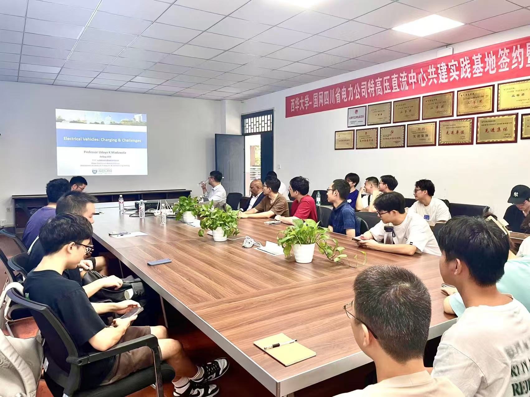 报告中Udaya教授分享了他的最新研究成果和学术观点,讨论了与电动汽车充电相关的挑战。并重点讲解了V2X应用中的电动汽车双向无线充电、电动渡轮的有线和无线快速充电、大功率转换器、能源管理以及如何减轻电动汽车充电对电网的影响等相关内容。Udaya教授的讲座内容丰富并且深入,为在场的师生们提供了宝贵的学术启示。