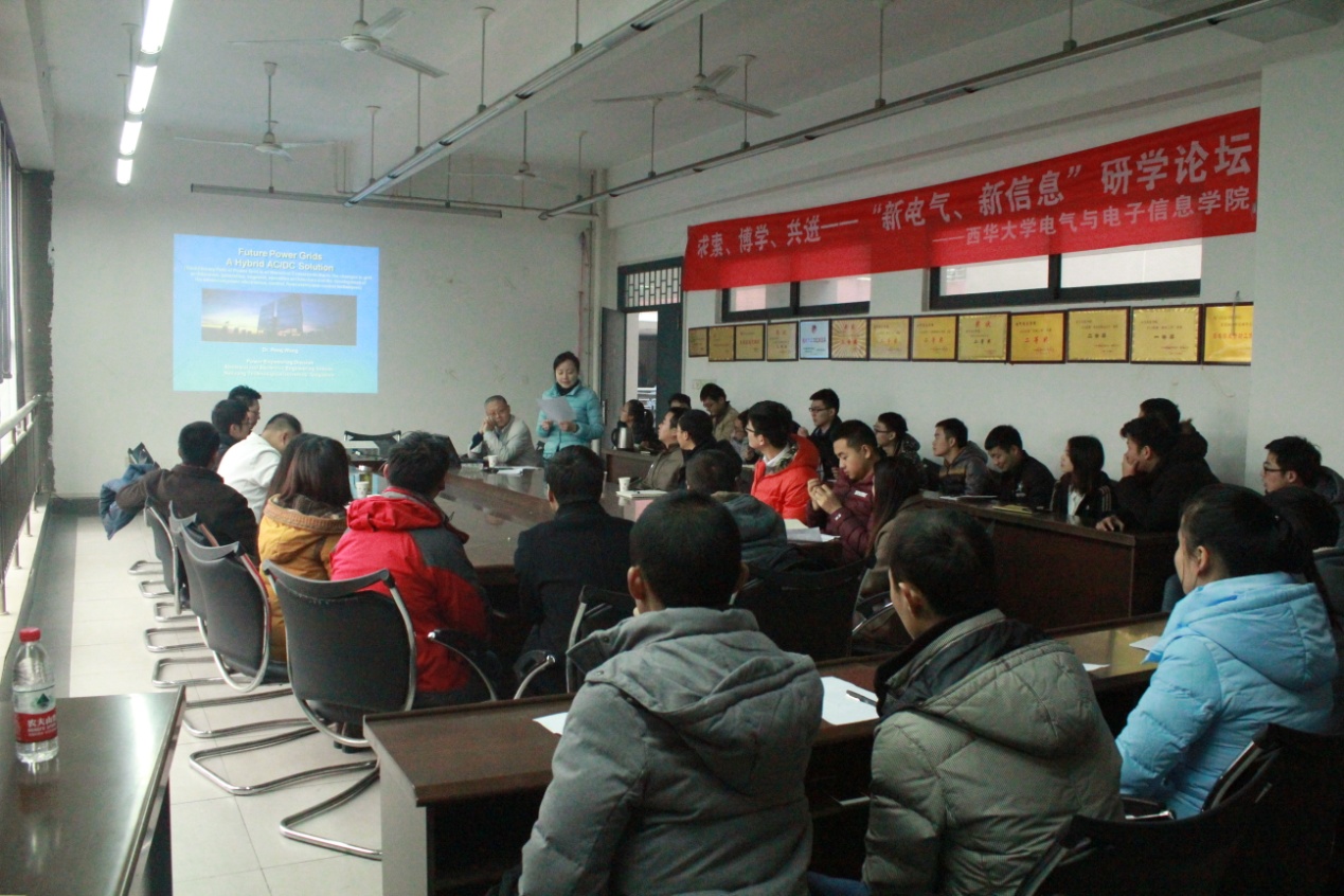 2017年1月4日上午10:00,“新电气、新信息”研学论坛第五十期学术交流会在西华大学6A-301举行,王鹏教授应邀做了题为“Future Power GridsA Hybrid AC/DC Grid Solution”的专题讲座。本次讲座由bw西汉姆联雷霞教授主持,学院部分老师以及研究生参加了本次交流论坛讲座。