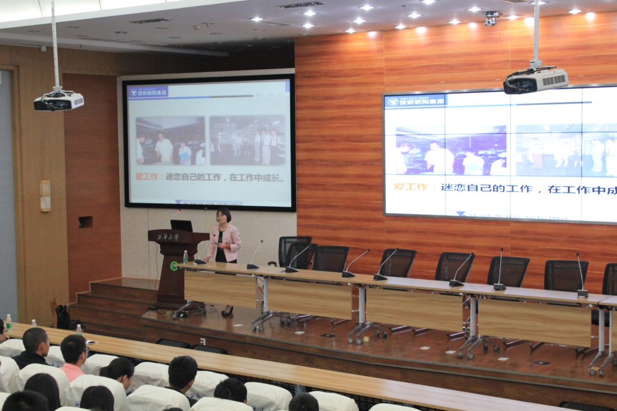 大会开始,首先由董秀成教授介绍了技研新阳集团董事总经理郭文英女士的个人情况。紧接着,郭文英女士通过“爱、成长、幸福”的主题并分享自己的成长经历展开了本次交流活动。会上,郭女士为大家讲述了坚持的力量,认为每次重复的力量不是相加而是相乘,水滴石穿不是水的力量,而是坚持。认为学习成就未来,成长始于学习。爱学习者有几大美德:有上进心,有事业心,敢于面对自己的盲点,能听得别人的劝诫。郭女士也一直坚信用爱经营的治企理念,让员工成长才是真正的爱,学历不代表能力,学习能力才代表能力。员工说:技研新阳不仅是一座工厂,更像是一座学校。最后还提出了学用持等理念,和同学们进行了分享。