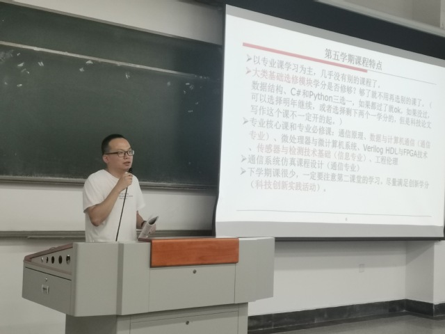信息工程系主任郭奕老师详细介绍了电子信息类下学期的课程安排与学科特点。会上郭奕老师明确指出,19级是学院教学计划调整的第一届,随着时间的推移,课程量会逐渐下降。“希望大家都能在这逐渐空闲的时间里细细斟酌,明确自己对未来的目标与规划。”