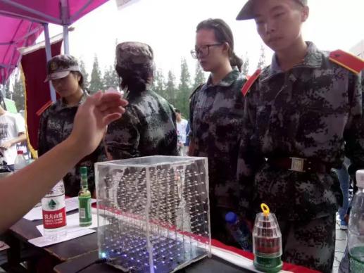 在宣讲活动现场,自制无障碍赛车,8*8*8光立方,无人驾驶飞机等悉数闪亮登场。其中最引人注目的要数光立方了,据学长们介绍,这是一个以51系列的单片机为主要的控制芯片,通过512个LED灯搭建起来的一个8*8*8(长,宽,高)16cm*16cm*16cm的立方体,采用的是延时控制LED灯的亮灭,以用来呈现绚丽多彩的立体画面,造型和不同的图案,创新实验室的学长学姐们还为新生们耐心并且详细讲述的光立方的制作过程,设计原理和焊接方法,并对提出学弟学妹提出的问题一一进行解答。