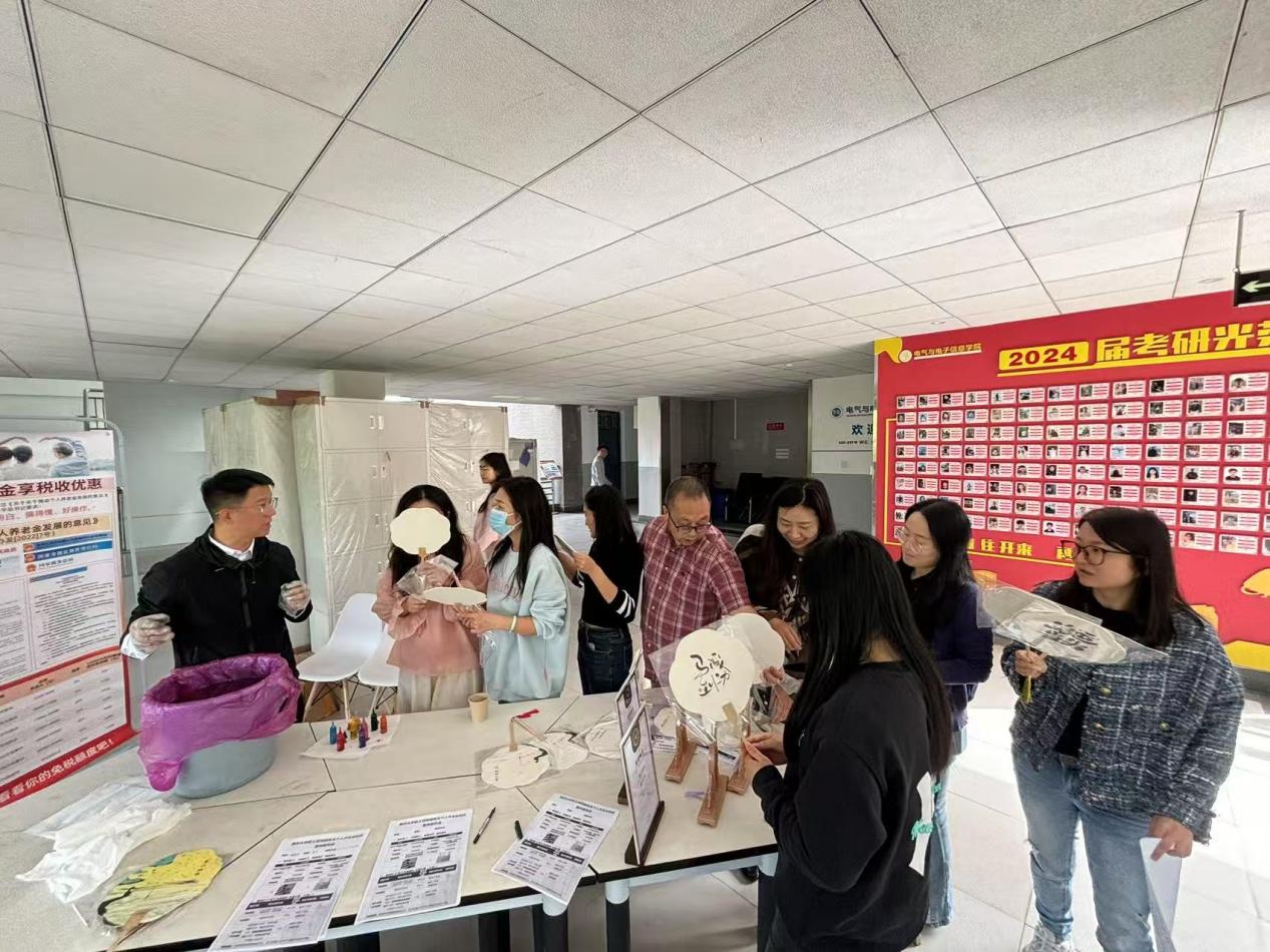 活动以非遗漆扇制作开场。女教职工们在专业指导下,将大漆颜料滴入水中形成纹理,通过提拉、旋转等技法让扇面晕染出独特图案。古典山水、现代抽象等创意作品接连呈现,现场惊叹声不断。