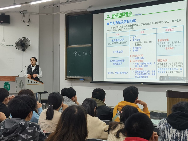 会上,王老师谈及了就业主题。她从电气行业角度出发,梳理了电力市场等相关企业情况,并指出国网和南网是大部分电气学子的选择,希望同学们在之后的学习中能明确个人目标,注重理论与实践相结合,这样才能在众多的应聘中脱颖而出。