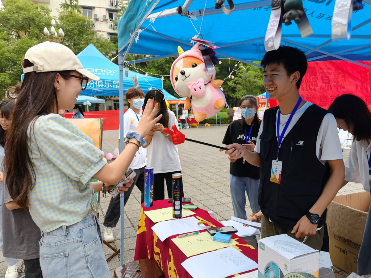 活动共有探索趣味密语、放飞心灵、指向不一和往事如烟等四个项目,面向全校师生提供了情绪调节平台,营造了良好校园心理健康氛围。活动现场人头攒动,师生都被吸引并参与到活动之中。同学们欢声笑语,表现亮眼,高招频出,引得围观群众惊呼连连,喝彩一片。明德广场热闹非凡。