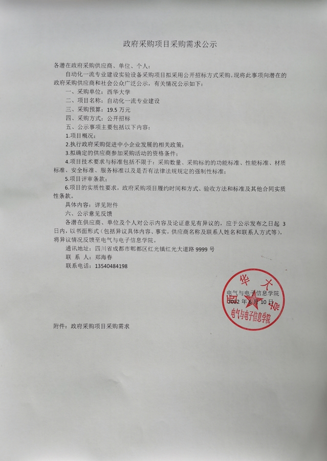 政府采购项目采购需求公示(货物类):自动化一流专业建设 (公示期:2022.6.10-6.12)