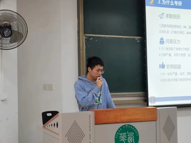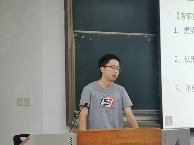 辅导员叶凯依次介绍分享人后,从报考人数、考研形势、最新考研情况向同学们做了详细分析。希望广大考研学子明确考研初心,不为逃避就业和随大流而“被考研”。