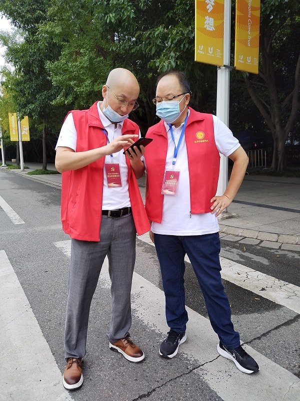 电气学院党委书记周良辉(右一)和党委副书记郭忠林(左一)参与志愿服务
