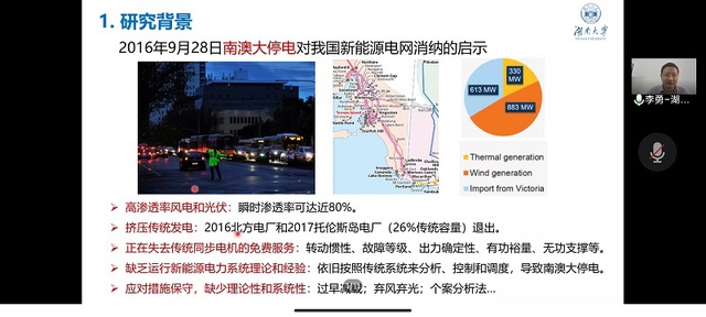 本次讲堂主要从分散式新能源并网稳定性的研究背景、主要工作、成果推广及研究展望四个方面开展。李勇教授首先介绍了“构建以新能源为主体新型电力系统”的意义。他认为这种新型系统是党中央基于加强生态文明建设、保障国家能源安全、实现可持续发展做出的重大决策部署,具有重大战略指导意义。此外,他简要阐释了新能源资源开发向分散协调发展模式转变的现状,并介绍了该模式与小水电、火电等多电源强耦合和并网运行所面临的三大主要挑战。