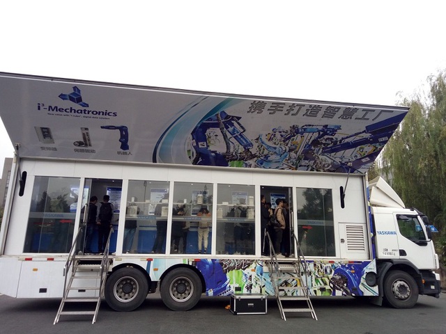 待同学们陆续到达活动现场后,进入展车参观智能制造产品。展车上陈列了DriveWizard Mobile智能手机应用、GA700高性能多功能变频器、MOTOMAN-GP8机器人等贴近生产与生活的智能产品。对陌生的智能制造产品,同学们表现出积极求知的态度,根据从课堂学习到的知识,对自动化、智能制造产品的原理、功能、应用等各方面提出了疑问,金鑫老师逐一做出解答。