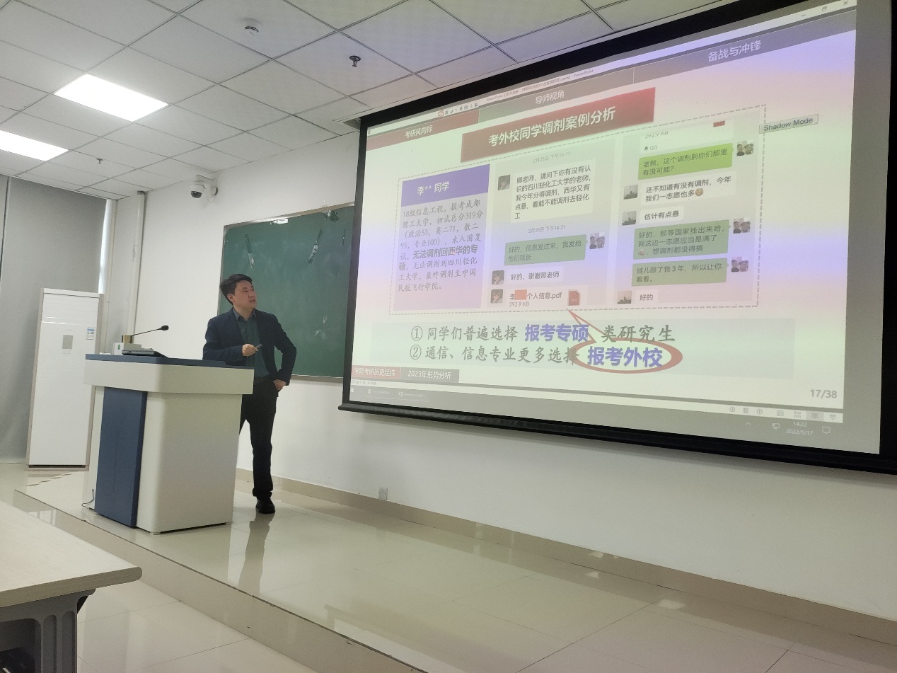 卿朝进介绍了我院的考研历史经纬,结合相关表格数据分析了学硕和专硕的报录比,进而预测并分析2023年的考研形势,深入剖析报考学硕和专硕的区别以及报考本校和外校的优势。此外,他还详细给出了备战考研三建议,包括时间规划、心态调节和复习技巧。