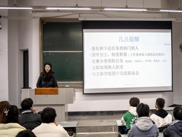 叶书记向大家展示了《2022年西华大学学科型学院年度目标任务考核得分情况》,结合西华大学校团委会议中提到的工作要点对大家提出了几点提醒和奖励机制。她表示,要把之后的工作任务内容量化,下达任务到部门、到人;进一步明确团委 学生会内部职责分工和制度框架,实现各部门工作量的均衡化;同时加强对品学兼优、工作认真的团干部的人文关怀,发放一定关爱补贴,并对日常考核表现优异者加以奖励。
