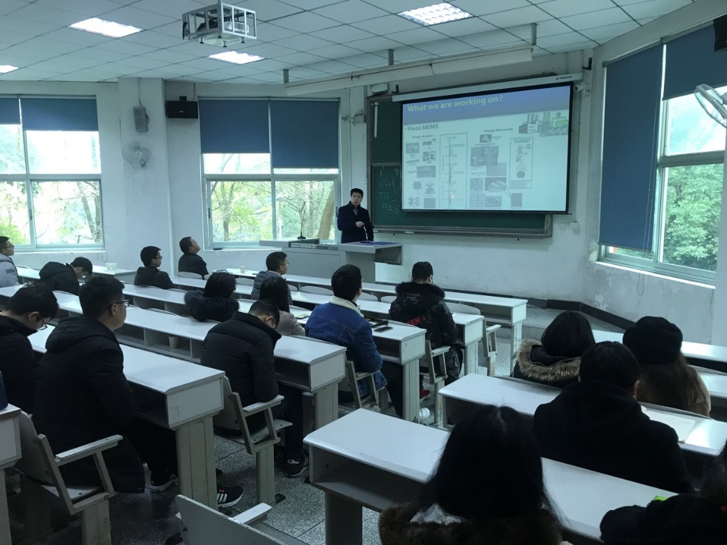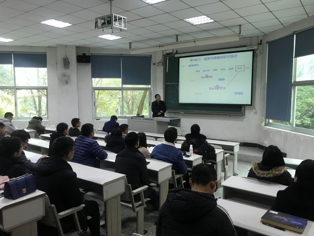 为丰富学生专业知识,邬祖全老师为同学们带来“基于聚苯胺的电阻式湿度传感器研究”的报告。邬老师从传感器的设计及制造的角度,讲解了换能器的选择方法和敏感材料的制备方式,分析了LBL法制备传感器的过程,最终生成基于聚苯胺传感器湿度敏感特性研究报告。为帮助同学们理解,邬老师和在场同学进行了良好互动并解惑答疑。