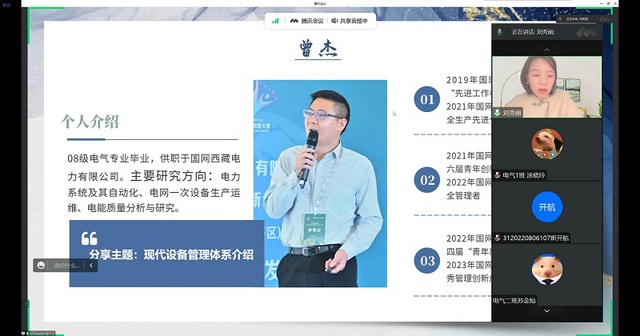 曾杰从电气学院本科毕业以后,积极响应国家号召,到西部去、到基层去、到祖国需要的地方去,2012年孤身一人去到了离家2000公里外的边疆工作,就职于国网西藏电力有限公司。充分发挥西华学子“知难而进、自强不息”的西华精神,为西藏电力事业发展做出了自己的努力和贡献。本次分享以“现代设备管理体系”为主题,详细介绍了国网设备专业组织架构及职责分工等内容,让同学们从专业角度提前就本专业职业及岗位有了新的理解和认识。