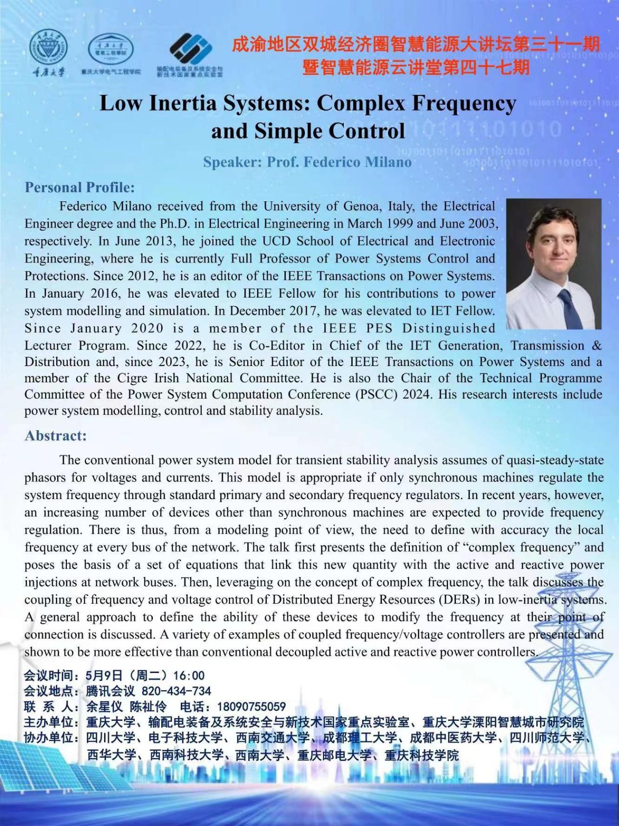 报告题目:Low Inertia Systems: Complex Frequency and Simple Control
