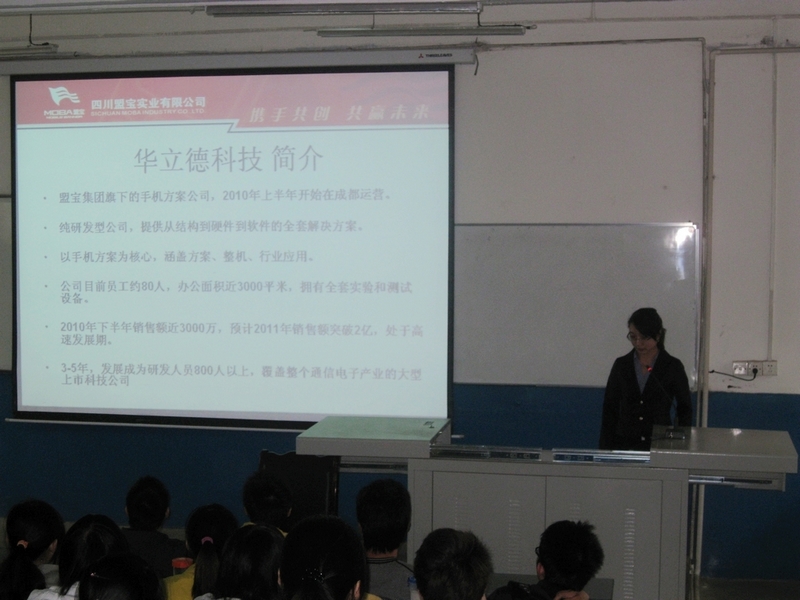 郑宇老师就华立德公司到校招聘的目的和介绍了前来宣讲的来宾后。宣传会便正式开始了,首先是一段视频向同学们展示了华立德科技有限公司及其母公司四川盟宝实业有限公司的发展历程。接着,陈经理就华立德科技有限公司的产业情况、工资待遇、地理位置及其企业文化几个方面进行了详细的讲解。华立德公司是一个创业型公司,拥有雄厚的资金和技术。公司职员的待遇水平也高于成都地区同类公司。目前公司正处于一个高速发展的阶段,需要大量年轻有创新精神的人才,能为进入公司的毕业生提供广阔的发展空间。