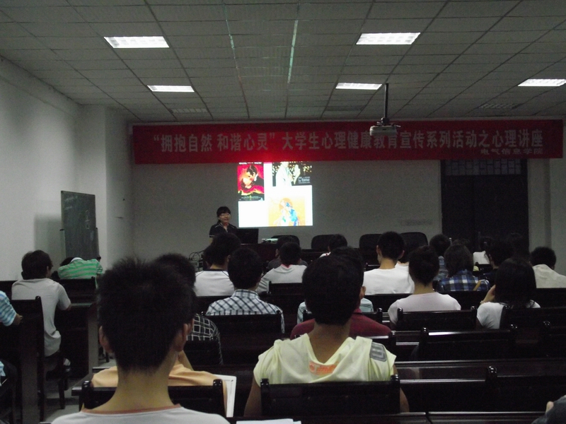 | 6月23日晚7点,由电气信息学院承办的“拥抱自然,和谐心灵”大学生心理健康教育宣传系列活动之心理讲座在6A—338举行。此次讲座特邀我校心理咨询中心唐璐嘉老师主讲。 唐老师首先从一个漫画故事引入,展开了本次讲座的主题“如果爱”。为了自己爱的人而改变,却失去了爱他的人,立即引起了大家的兴趣。她在播放的PPT里展示了很多描述爱情的电影、电视剧,让同学们对爱情有了更深的理解。 接着唐老师把话题切入到大学生最关心的校园爱情,给在场的同学们上了生动的一课——表达爱的能力、鉴别爱的能力、拒绝爱的能力、如何面对失恋、如何正常对待恋爱等等。同学们听得很投入,频频点头。唐老师幽默诙谐的语言博得在场听众的阵阵掌声,现场气氛十分热烈。 最后,唐老师给同学们留下邮箱地址,希望以后在心理上遇到挫折的同学能与她多多交流。此次“拥抱自然,和谐心灵”大学生心理健康教育宣传系列活动心理讲座在热烈的掌声中圆满结束。 |