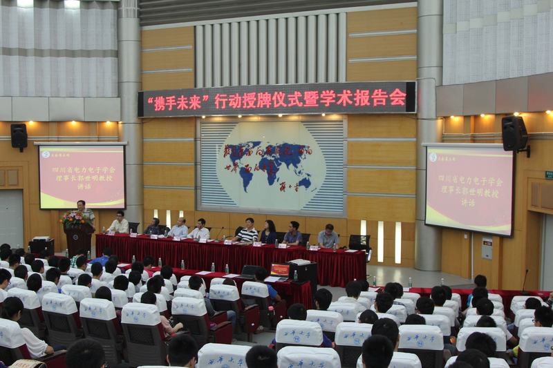| 9月24日下午,四川省科协、四川省电力电子学会与西华大学电气信息学院电气协会校会合作“携手未来”行动授牌仪式在四教报告厅举行。省科协党组成员黄竞跃副主席,省科协学会部肖咸君部长,省电力电子学会常务理事郭世明教授,学会副理事长兼秘书长李凤元高工,东方日立公司副总工程师彭良平高工,省电力电子学会副秘书长兼东方日立企管部沈静云部长,省电力电子学会副秘书长、西南交大国家自助化工程中心办公室主任吴松荣副教授,电气信息学院院长王军教授,党委副书记周川,副院长魏金成及我院部分教师代表、电气协会、创新实验室、科创爱好者等300名学生代表参加本次大会,会议由周川主持。 会上,王军院长感谢省科协为学校、学院学生协会搭建学术交流平台,指出活动提高了大学生对科技创新的认识,增强了大学生实践活动能力,将为电气学子带来了更好的发展和学习机遇。黄竞跃副主席在讲话中强调了举办“携手未来”行动的意义、作用。随后,郭世明教授谈到电力电子行业的发展方向以及涉及领域,针对信息电子技术与微电子技术进行了详细阐述。 在讲话后举行了隆重的授牌仪式,省科协副主席黄竞跃副主席和省电力电子学会常务理事郭世明教授,共同向电气协会学生代表刘文彬同学授牌。电气协会学生代表田涛同学在发言中表示希望通过这个平台,增强同学们社会实践能力、创新意识,成为社会需要的创新后备人才。 |