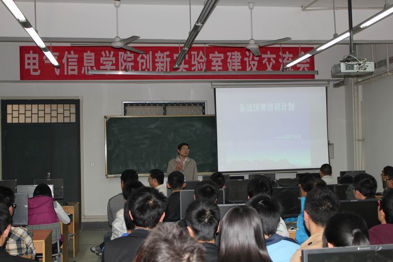 111日,由电气信息学院副院长魏金成主持的“电气信息学院创新实验室建设交流会”在6A222举行。学院党委副书记兼副院长周川、实验室指导老师李涛、曹林、徐学彬、古世甫等参与了此次交流会。创新实验室2010级、2011级全体同学聆听了老师们的相关讲解和备战国赛的一些列安排。