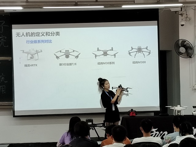 刘利红从无人机的定义及分类出发展开讲解。她为同学们播放了无人机入门指南视频,将不同类型无人机起降的简易程度、载荷、续航时间、便捷性等特点进行对比评价,并详细介绍了无人机的飞控系统。她谈到:“无人机的飞控系统就是无人机的‘心脏’。”此外,她还现场为同学们展示了各类无人机,让大家对无人机的类型及操作有了更多了解。