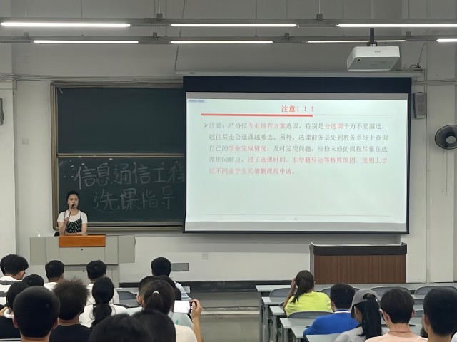 学院信息工程系主任江婉结合信息、通信工程新一学期的课程安排,为同学们分析了新学期的课程特点。她强调:“同学们应以学科基础课的学习为主,上课的同时,应注意参加第二课堂的锻炼。”