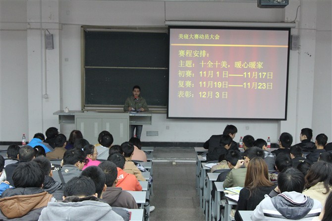学工办主任郑宇老师首先在动员会上作了发言,郑老师首先为与会同学讲解了美寝大赛的意义和作用,他指出美寝大赛全国大部分高校必有的活动之一,目的在于提高同学的审美观,锻炼同学们的团队协作能力,为同学营造一个良好的生活环境;然后郑老师为大家讲解了美寝大赛的一些注意事项;最后,他还强调美寝大赛作品要有创意,用最绿色最环保的方式来美化寝室。