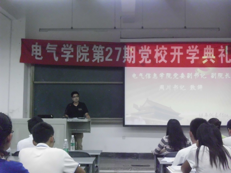 | 通讯员:李虹 吴阳阳 2011年9月16日,电气信息学院在6B108隆重召开第27期党校开学典礼。又一批品学兼优的电气学子,在学院的推荐下进入党校学习。参加本次开学典礼的有电气信息学院党委副书记、副院长周川书记,我院学工办主任郑宇老师,团委书记刘秀丽老师以及学院的辅导员等,电气信息学院第26期党校的部分优秀学员及第27期党校的全体学员。 开学典礼在庄严的国歌声中正式拉开序幕,在主持人的介绍下,利用PPT的形式向大家展现了历届电气学院党校所取得的成绩。接着周川书记为此期开学典礼致辞,在致辞中周川书记为同学们讲解了党的历史文化,并带领同学们回顾了中国共产党建立90周年来的发展,同时也对本次学员提出四点要求:1、要充分做好入党准备;2、用实际行动接受组织的考验,积极向党组织靠拢;3、希望同学们在培训中坚持理论结合实际的原则;4、着重加强学员的组织纪律性。 随后本期党校班长李本曾同学向新学员讲述介绍了本次党课的管理模式,提醒新学员们党校学习各个注意事项。他代表整个党校的班组长保证——尽职尽责的做好工作,继续在本期党校取得优异的成绩。第二十六期党校优秀学员代表汪剑向新学员讲述了自己的学习心得和学习经验。本期学员代表王伟伟发言,表达了要努力学习,严格遵守党校纪律,充分利用党校学习的机会锻炼自己,接受党组织培训的决心。 最后,本次开学典礼在《国际歌》中画上了圆满句号。 |